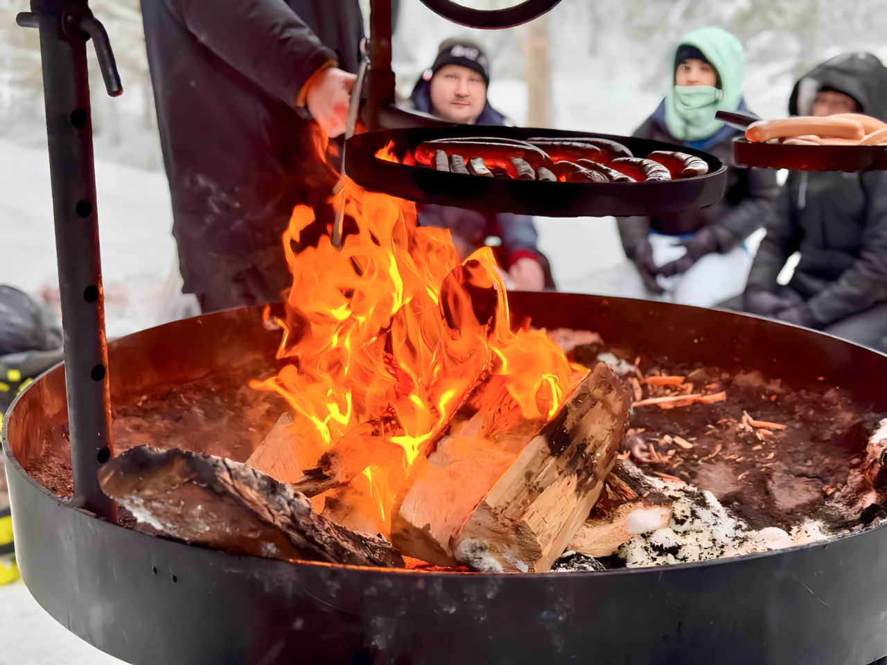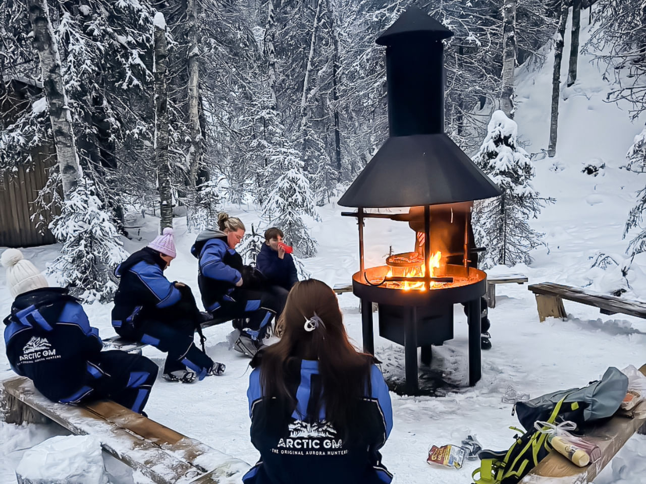 Midway, we pause for a wilderness break. Gather around the fire, enjoy hot drinks, and savor grilled sausages — a true Lapland tradition — while surrounded by the canyon’s frozen beauty.