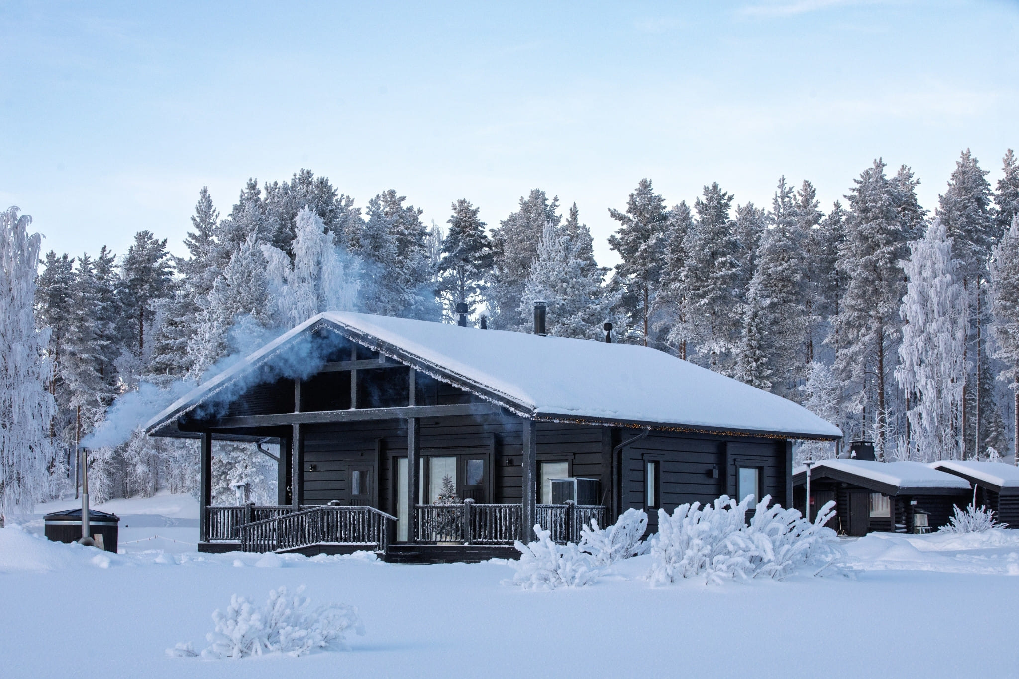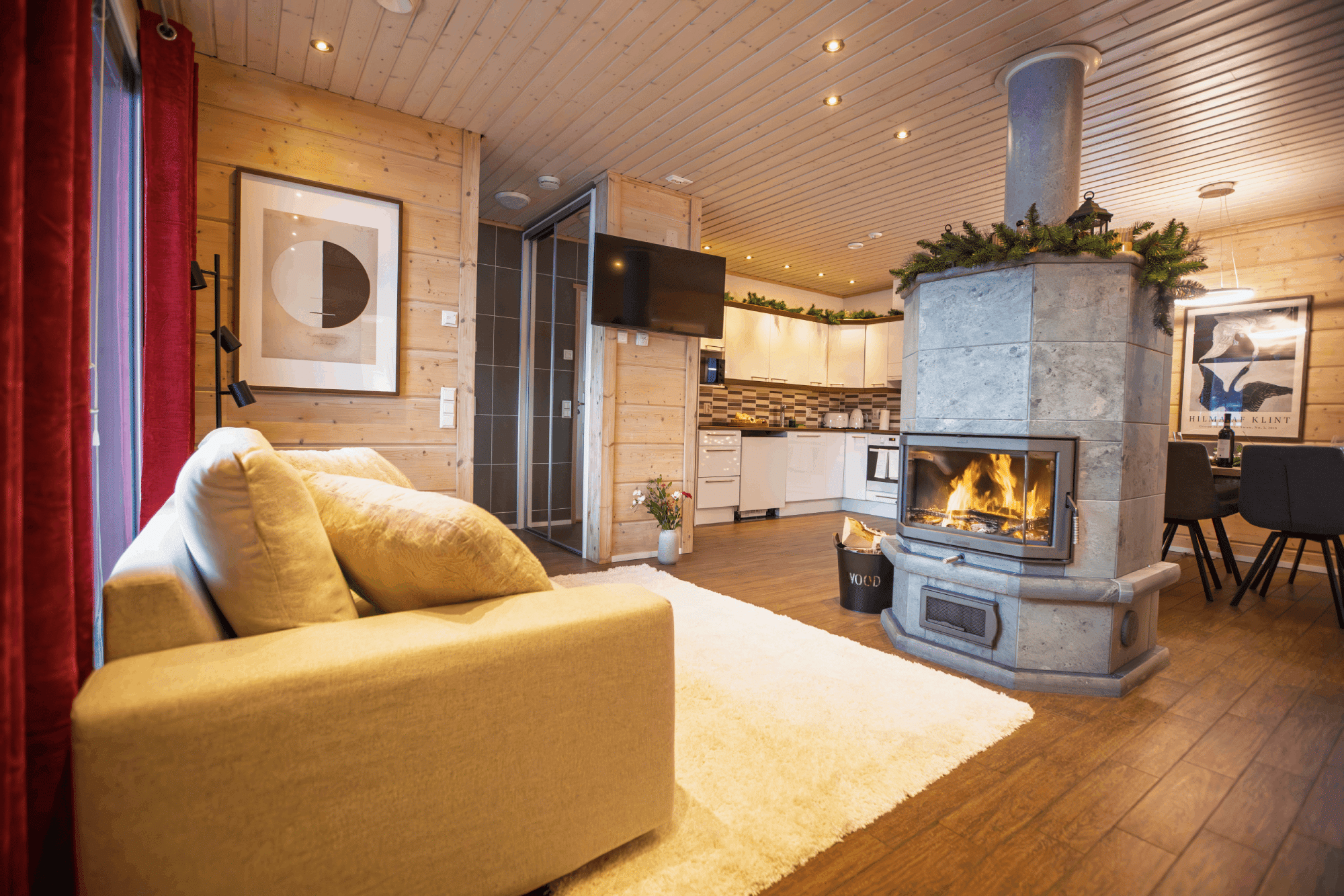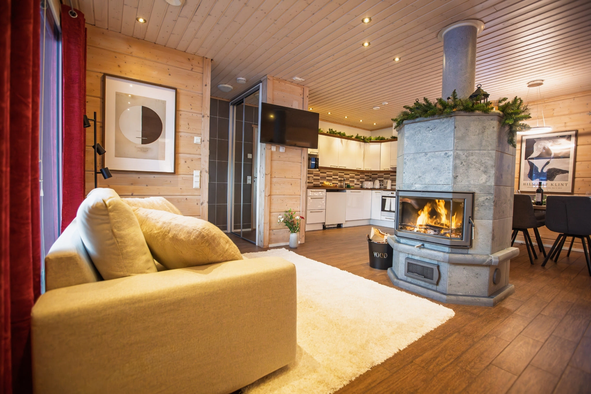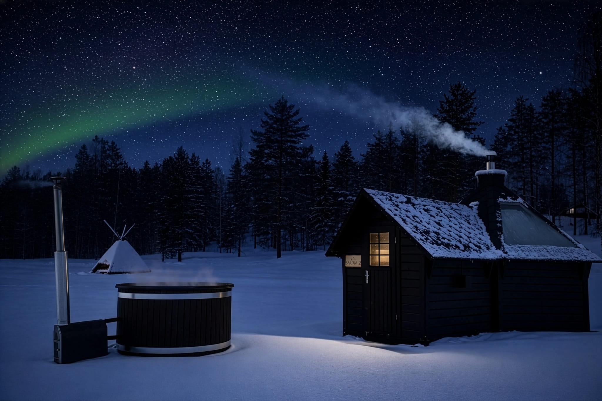 A private lakefront villa at Sonka Resort featuring a sauna, wood-heated hot tub, and spacious living in peaceful Arctic surroundings