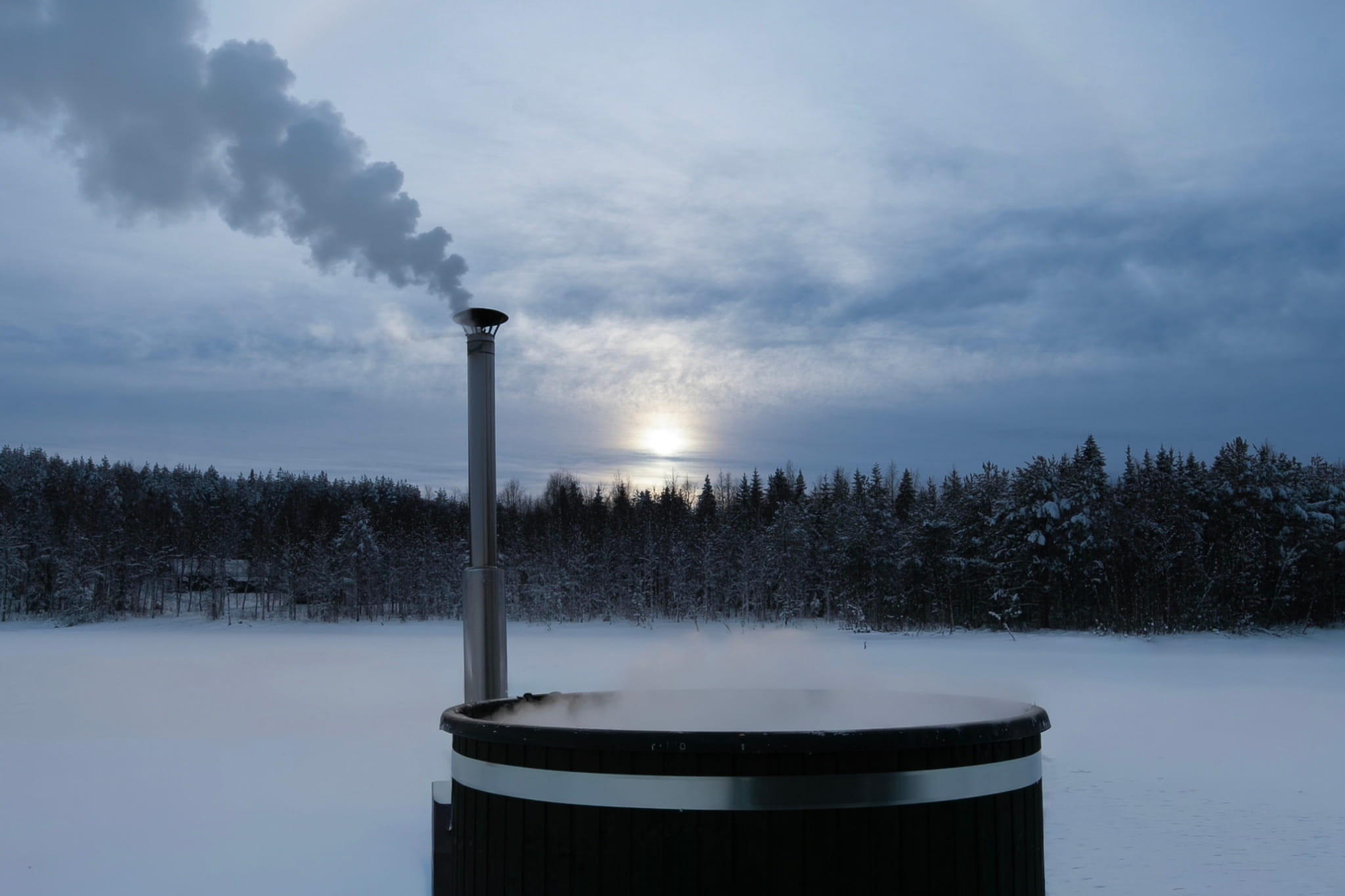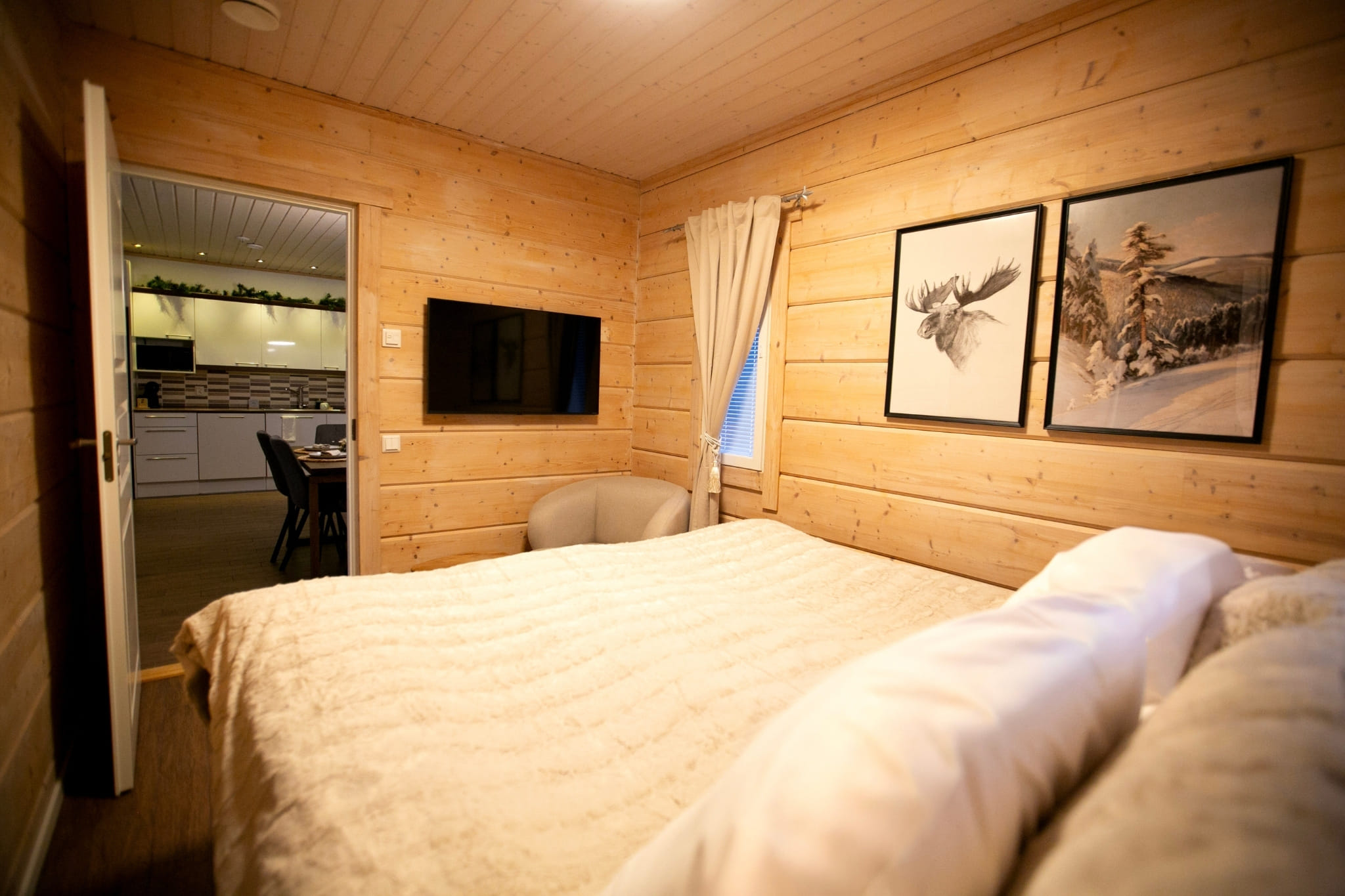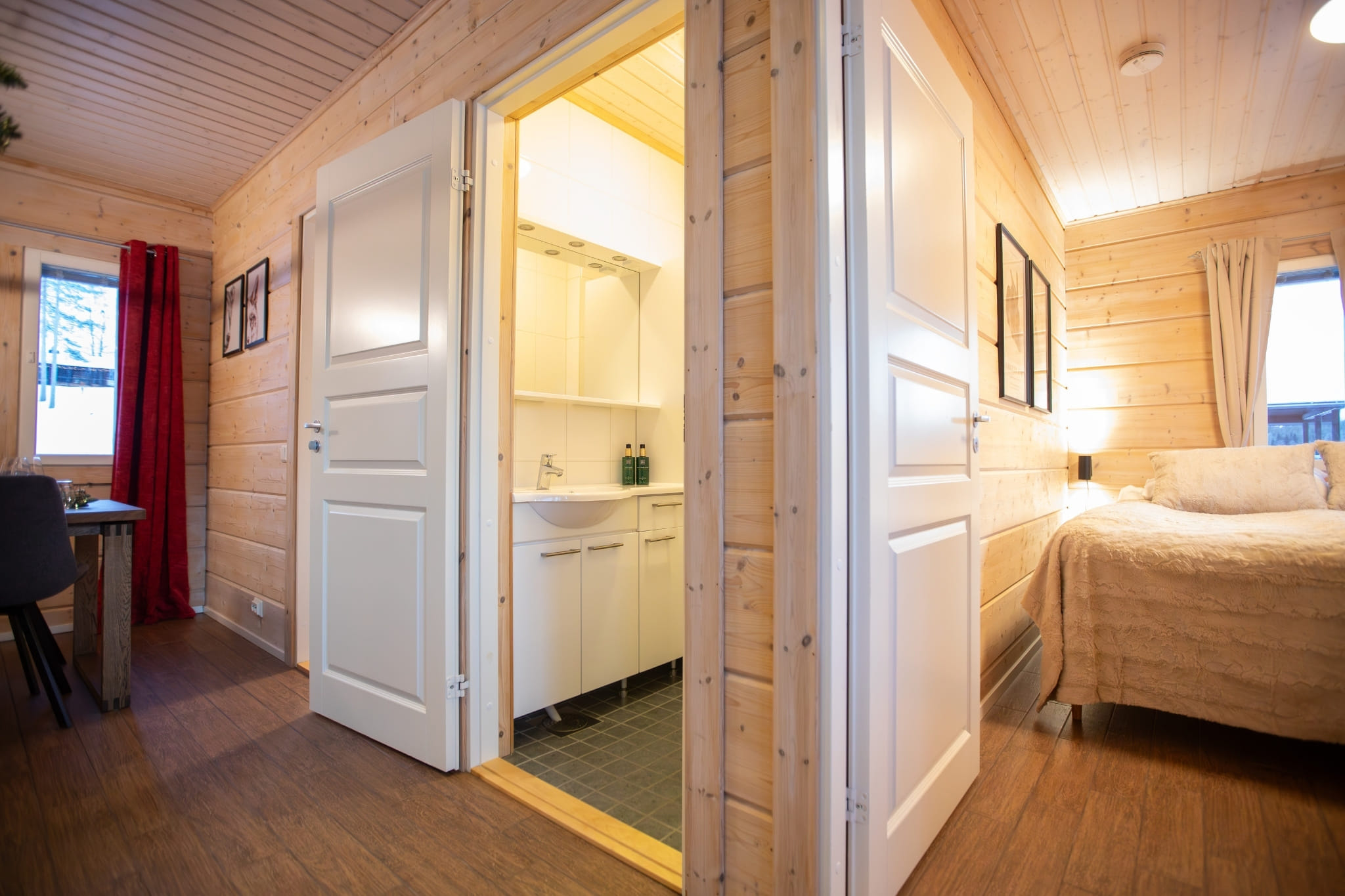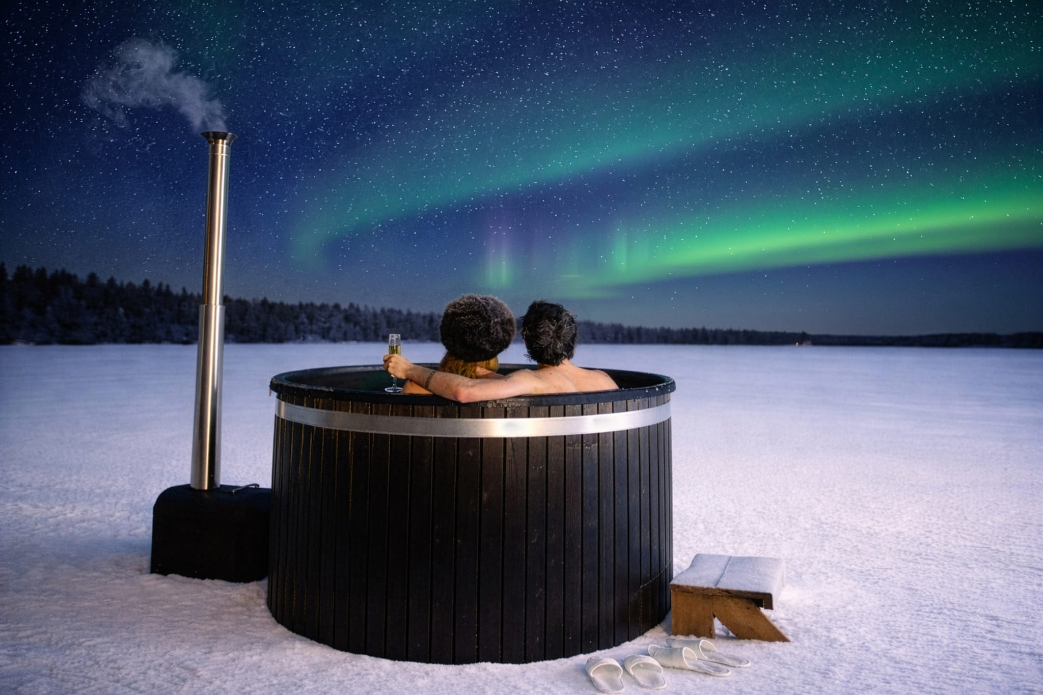 A private lakefront villa at Sonka Resort featuring a sauna, wood-heated hot tub, and spacious living in peaceful Arctic surroundings