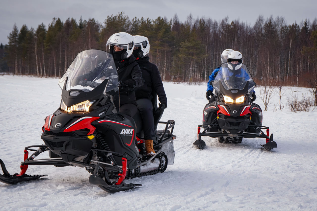 Ride brand-new 2025 snowmobiles across private forest trails and tundra, far from tourist tracks. Small groups (max 5 snowmobiles), expert guides, new helmets & gear, barbecue by the fire, and modern coach transfers